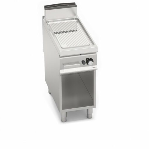 Piastra liscia ad alto spessore, a tutta misura con paraspruzzi a filo. Piastra di cottura bicomponente che combina una lastra di acciaio, per ottimizzare l’uniformità, ad un rivestimento superiore in acciaio inox AISI 316 con finitura lucida, per un’ottima pulizia e un basso livello di irraggiamento, con conseguente maggior comfort per l’operatore. Superficie di cottura leggermente inclinata con foro di scarico di grandi dimensioni e convogliatore in apposito contenitore a tenuta stagna. Ampio vano completamente in acciaio.